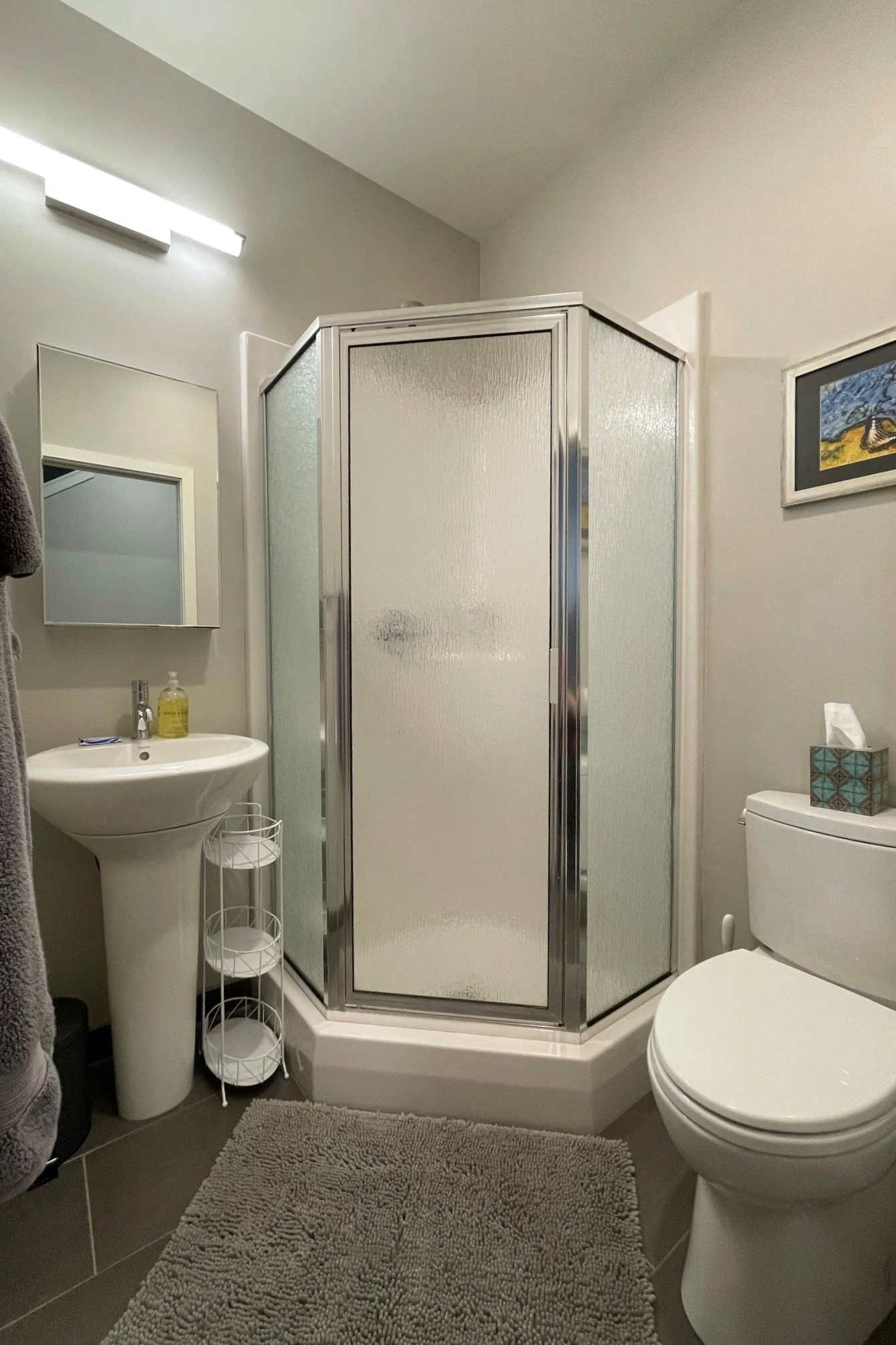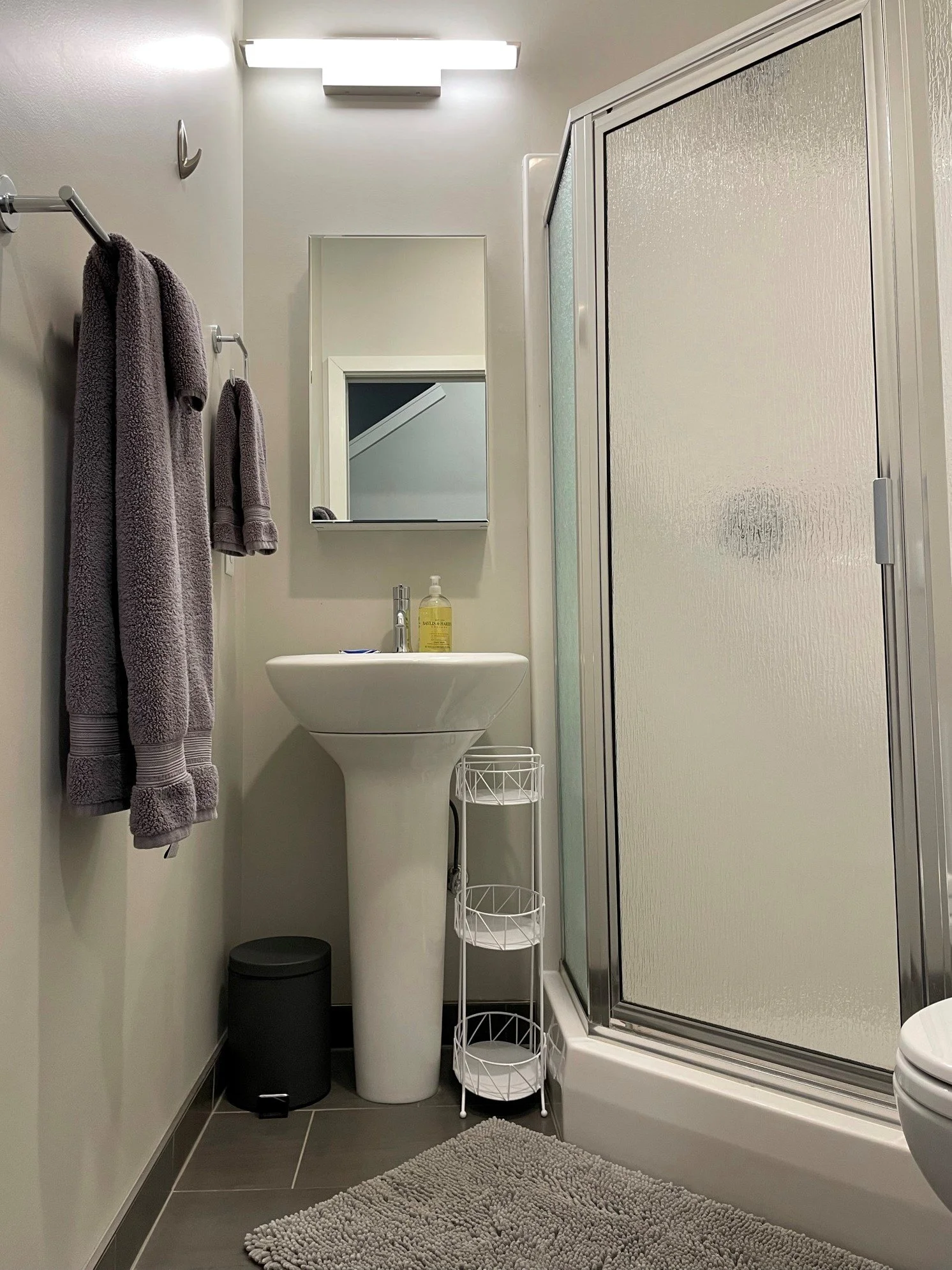 On the the upper level (up two flights of stairs on the 3rd floor) you can find the shared washer and dryer. Down one flight of stairs is the fully equipped modern kitchen and furnished living room with balcony, all of which are shared with the other guests. There's high-speed Wi-Fi throughout the townhome.