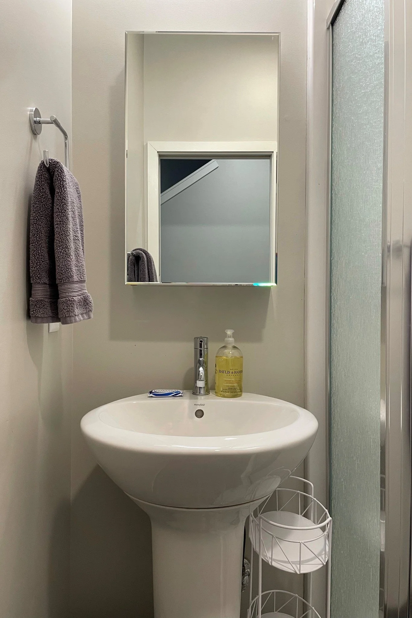 The full kitchen which is shared with other guests, is located in the common space on the mid level.